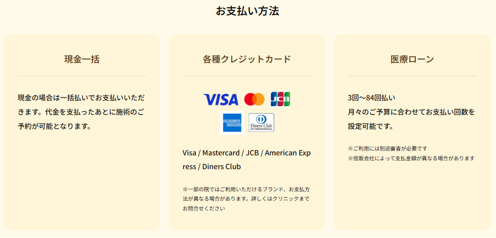 分割払いには、医療ローンとクレジットカードをご利用いただけます。医療ローンの場合、分割プランをご希望に沿った形でご提案いたしますので、詳細はカウンセリング時カウンセラーにご質問くださいませ。